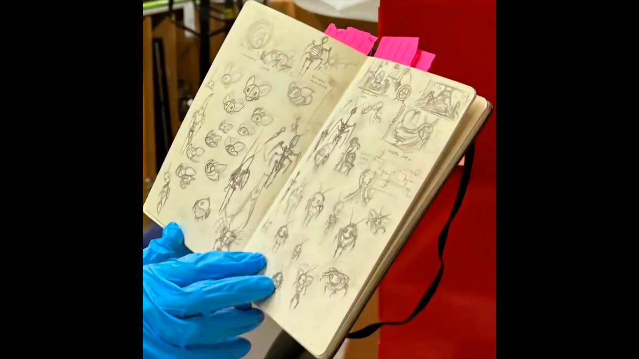 La otra imagen revela una libreta de bocetos repleta de criaturas, enemigos y expresiones faciales. Estas páginas evidencian el trabajo artesanal del diseño de personajes, desde ideas preliminares hasta versiones más estilizadas que probablemente llegarán al juego final.