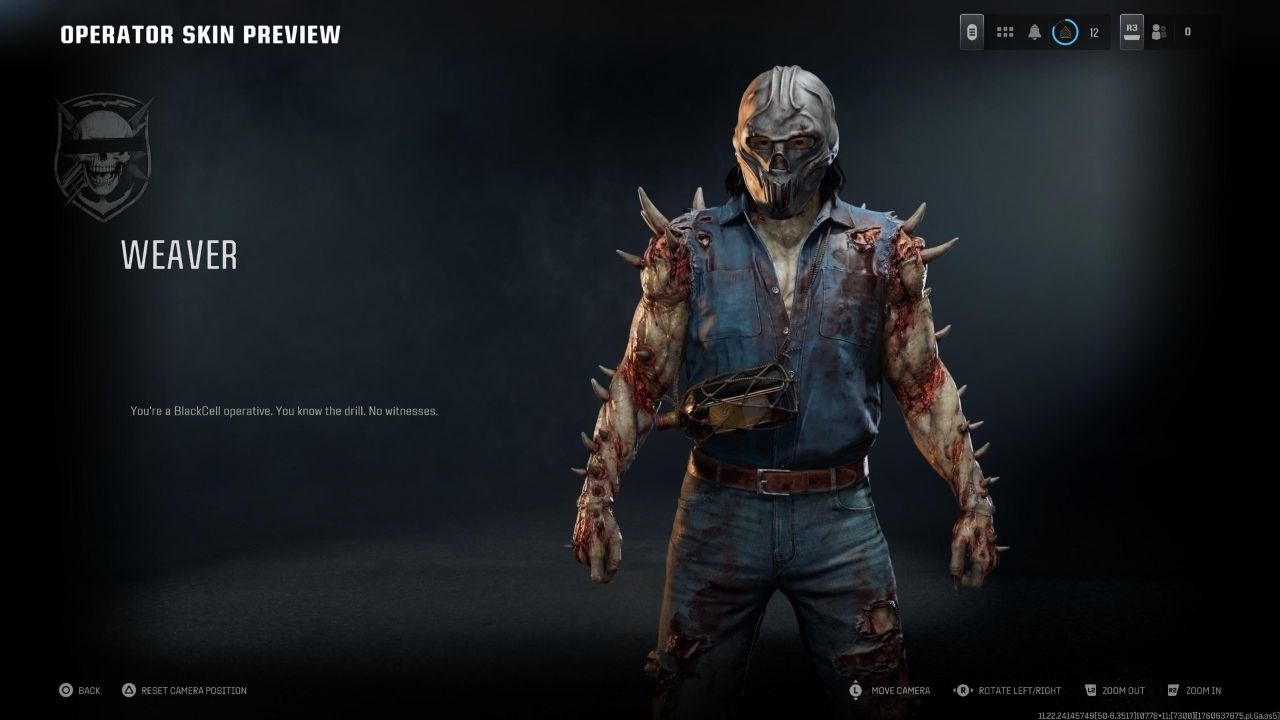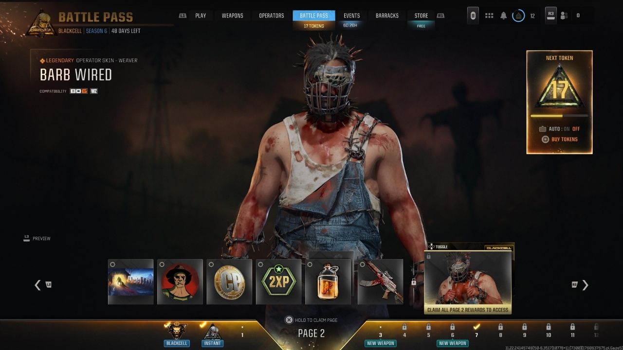 El apartado de skins, que suele ser la razón principal para comprar el pase, deja sentimientos encontrados. Después del Predator, la primera skin relevante aparece hasta la página 2, con Weaver – Barb Wired, una interpretación de horror inspirada en Halloween y Hellraiser que, pese a su concepto, resulta algo genérica. Su variante —una figura enmascarada al estilo Viernes 13 con overol mecánico— tampoco logra destacar.