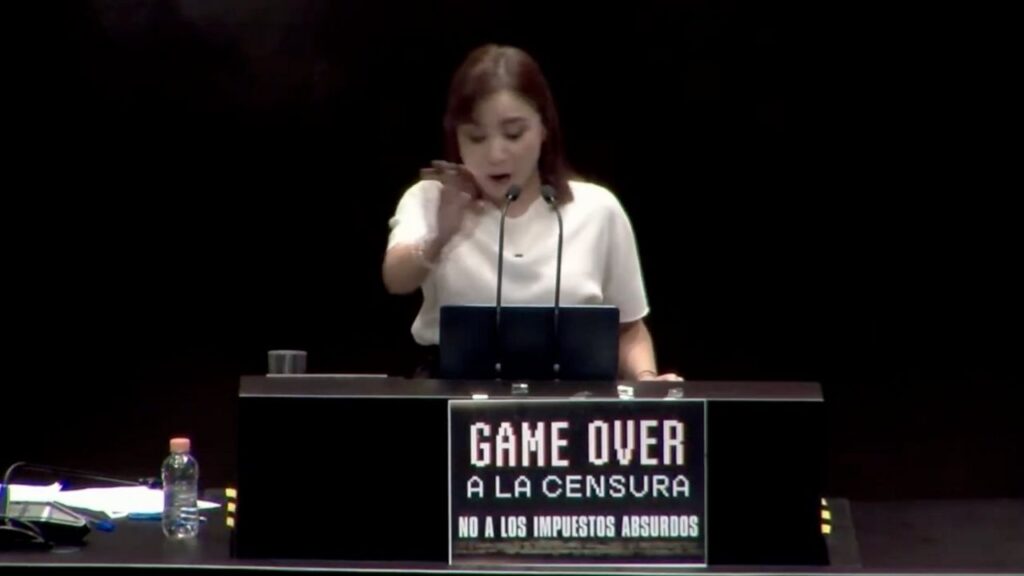 Subió a la tribuna con un cartel en el atril que rezaba: “Game Over a la censura. No a los impuestos absurdos”, como protesta directa contra el llamado impuesto saludable que busca gravar con un 8% adicional a los videojuegos catalogados como violentos.