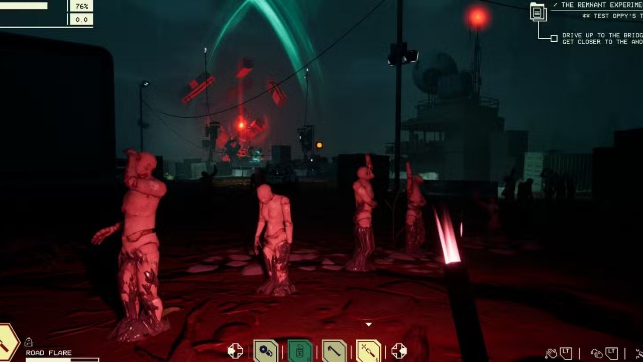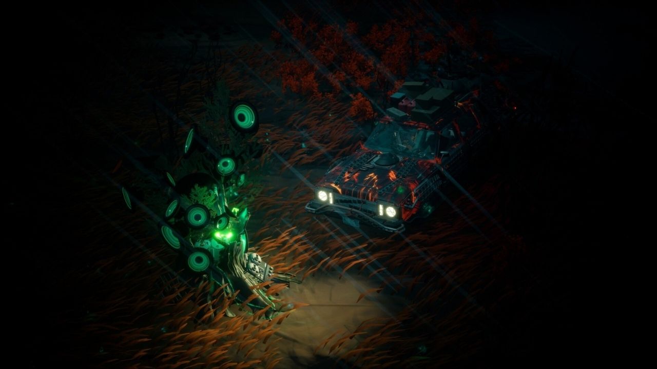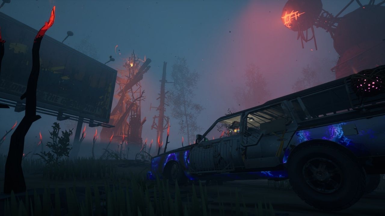 El juego mantiene su núcleo roguelite: salir, explorar, recolectar chatarra y sobrevivir para mejorar tu auto en el taller. Pero ahora todo está teñido de rojo, como si el propio bosque quisiera devorarte.