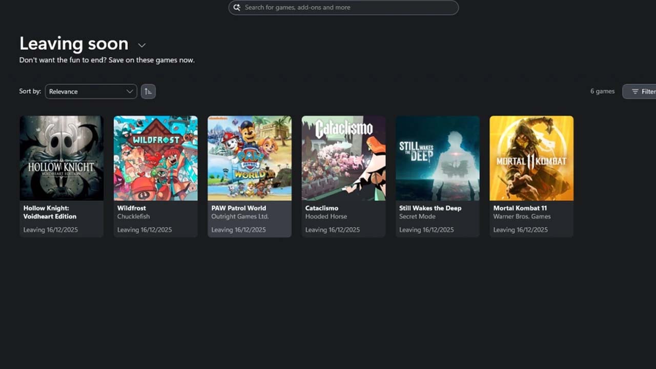 Los que abandonan incluye a Mortal Kombat 11, Cataclismo, Still Wakes the Deep, Wildfrost y Paw Patrol World.