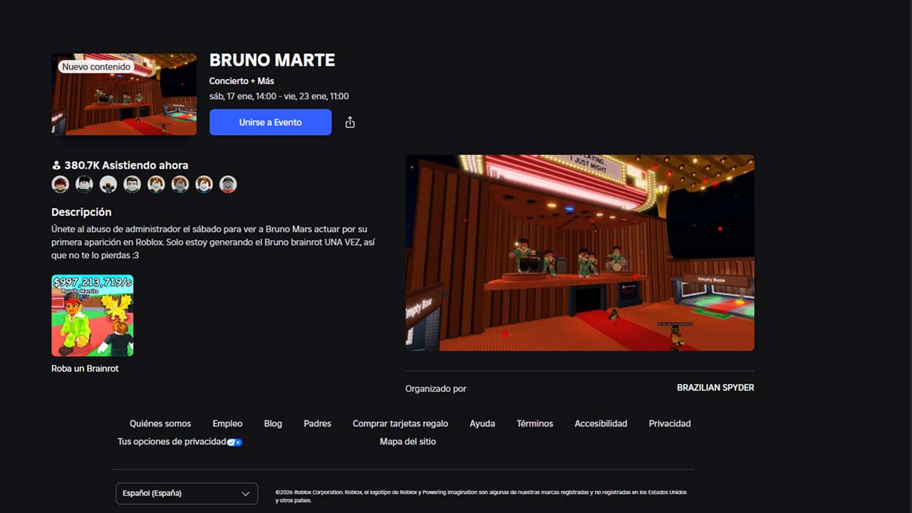 Bruno Mars llegará a Roblox con un concierto exclusivo dentro de Steal a Brainrot, un evento digital de duración limitada que solo podrá vivirse una vez.