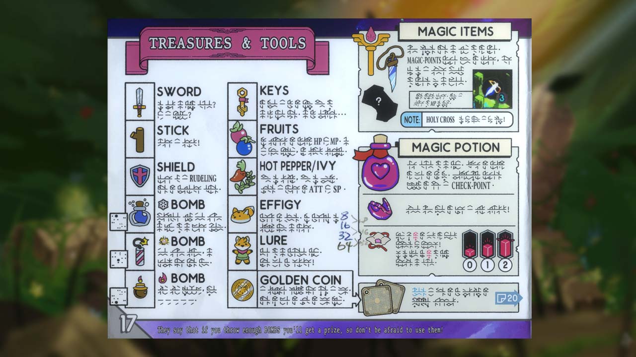 Este manual, inspirado claramente en los libretos físicos que acompañaban a los Zelda clásicos de NES, se encuentra página por página a lo largo de la aventura y funciona como guía, mapa, archivo de conocimiento y pieza narrativa al mismo tiempo.
