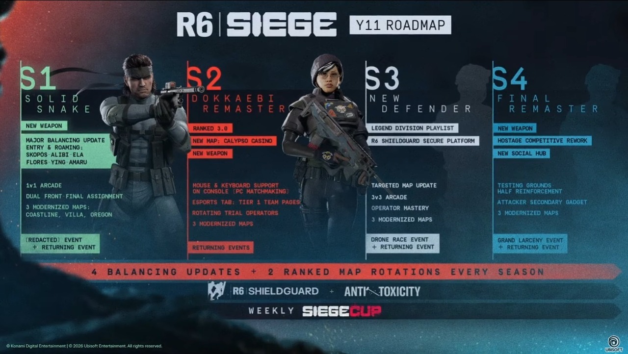 Ubisoft anunció que Solid Snake, protagonista de la saga Metal Gear, se incorporará como agente jugable en Rainbow Six Siege durante el mes de marzo, en el marco del contenido del Año 11.