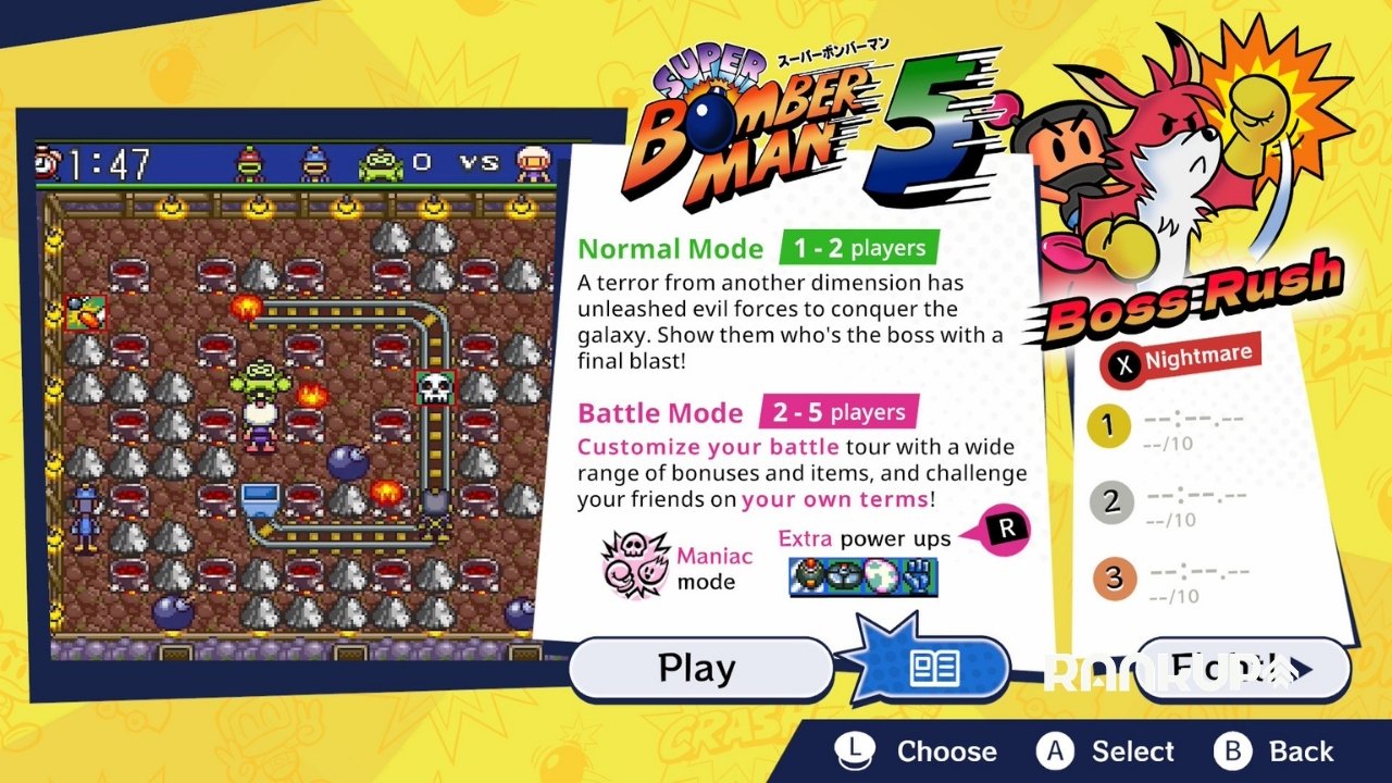 Rango Épico para un gran clásico. Super Bomberman Collection rescata la era dorada de la saga con cinco clásicos de Super Nintendo y extras modernos como guardado rápido y rebobinado.