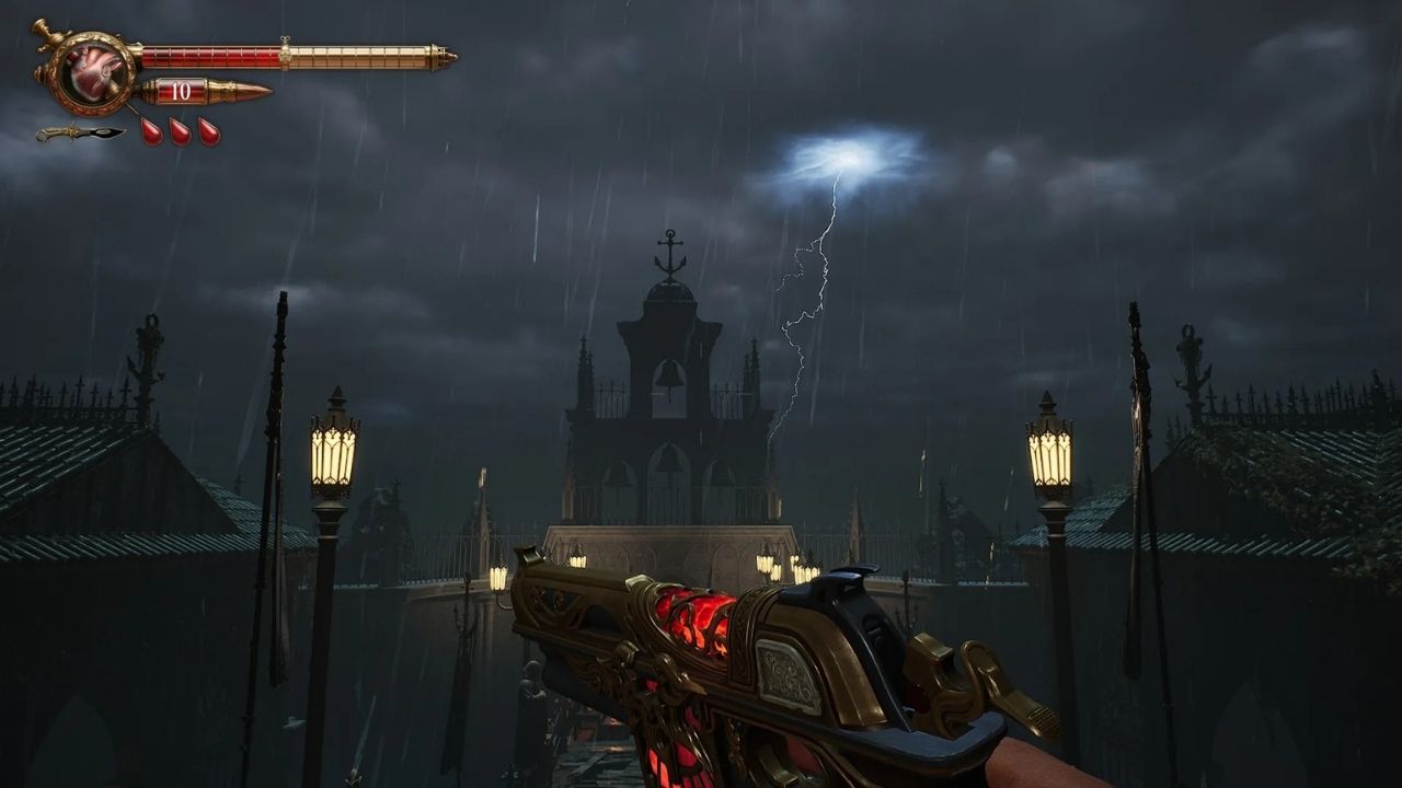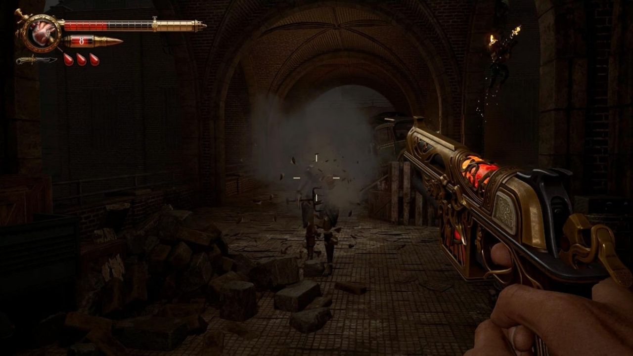 Sin embargo, su gran acierto es la recarga con sangre. Cada vez que decides rellenar tu arma, sacrificas vida. Esa simple decisión convierte cada enfrentamiento en una negociación tensa.