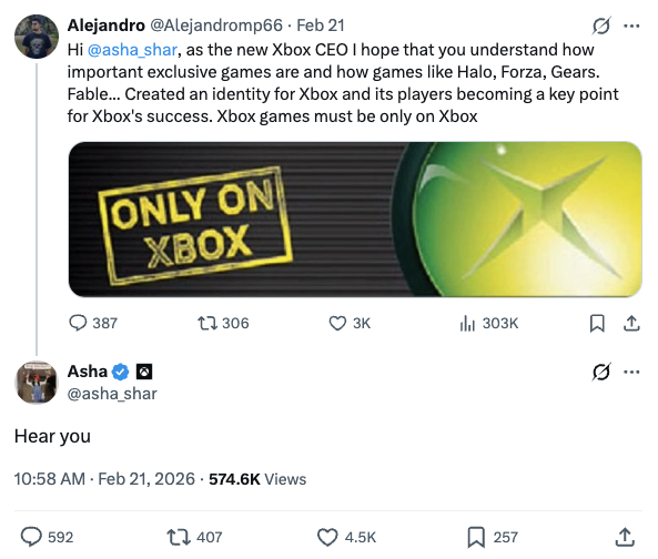 Todo comenzó con la petición de un fan en redes sociales, quien solicitaba un regreso a los orígenes: exclusivos de peso que definan la consola. Ante la pregunta de si Xbox volvería a apostar por títulos que no salgan en otras plataformas, Sharma respondió con un escueto pero potente: