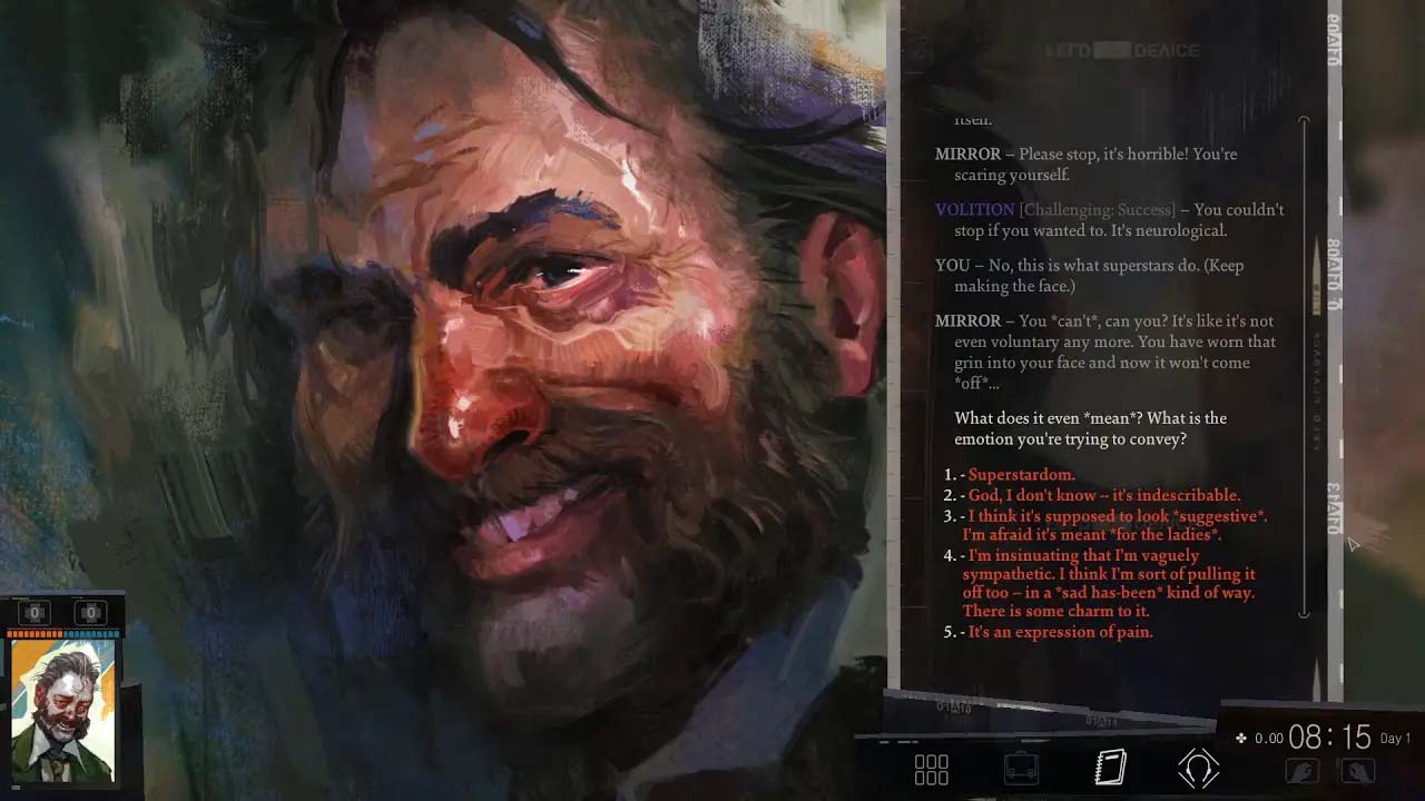 Esta obra rompe con las convenciones al eliminar el combate tradicional en favor de un sistema de diálogos estratégico. El núcleo del juego son sus 24 habilidades, como “Cálculo Visual” o “Imperio Interior”, que funcionan como voces en tu cabeza que debaten entre sí e influyen en cómo percibes el mundo.