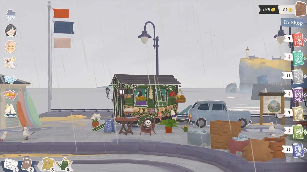 Es una experiencia diseñada para ser relajante y sin presiones, donde viajas a ubicaciones como la playa o el mercado para ofrecer libros y artículos que satisfagan los gustos de los residentes.
