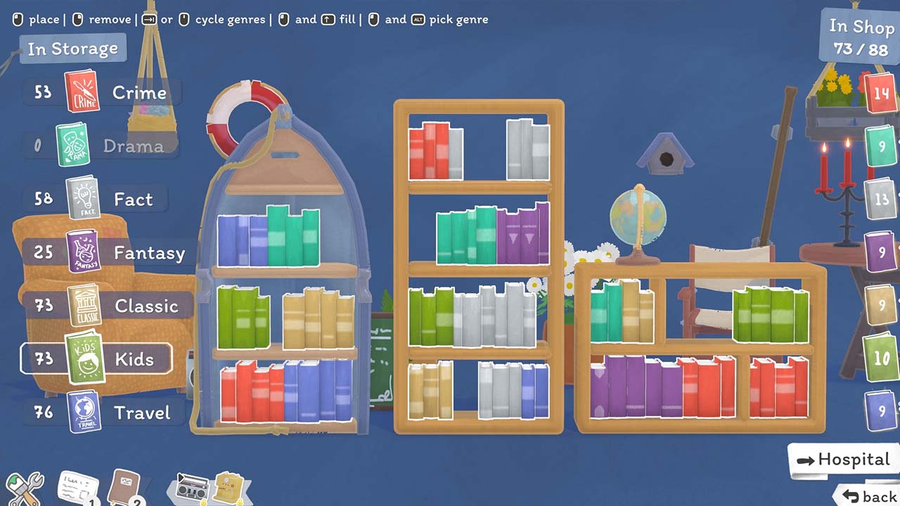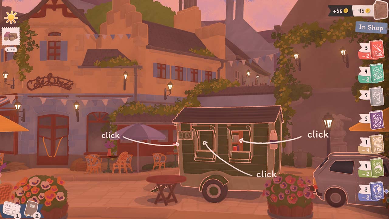 La mecánica central se divide en la planificación diaria y la interacción con los clientes. Debes abastecer tus estantes comprando cajas de libros a través del periódico local y decorar tu tienda con objetos que otorgan beneficios específicos o modifican las probabilidades de venta.