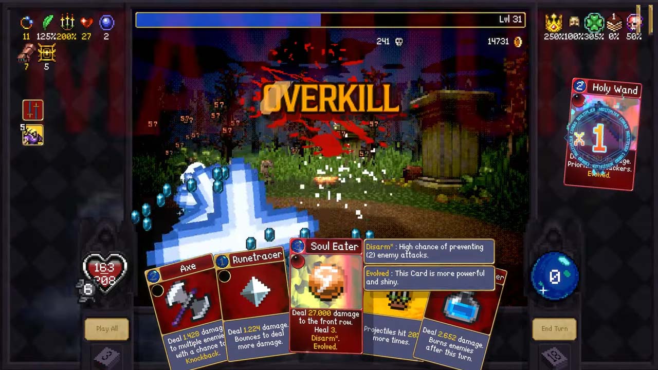Al igual que en el juego original, podrás realizar evoluciones de armas combinando cartas específicas y recolectar gemas para potenciar tu mazo, permitiendo crear combinaciones “rotas” que pueden volverse casi infinitas.